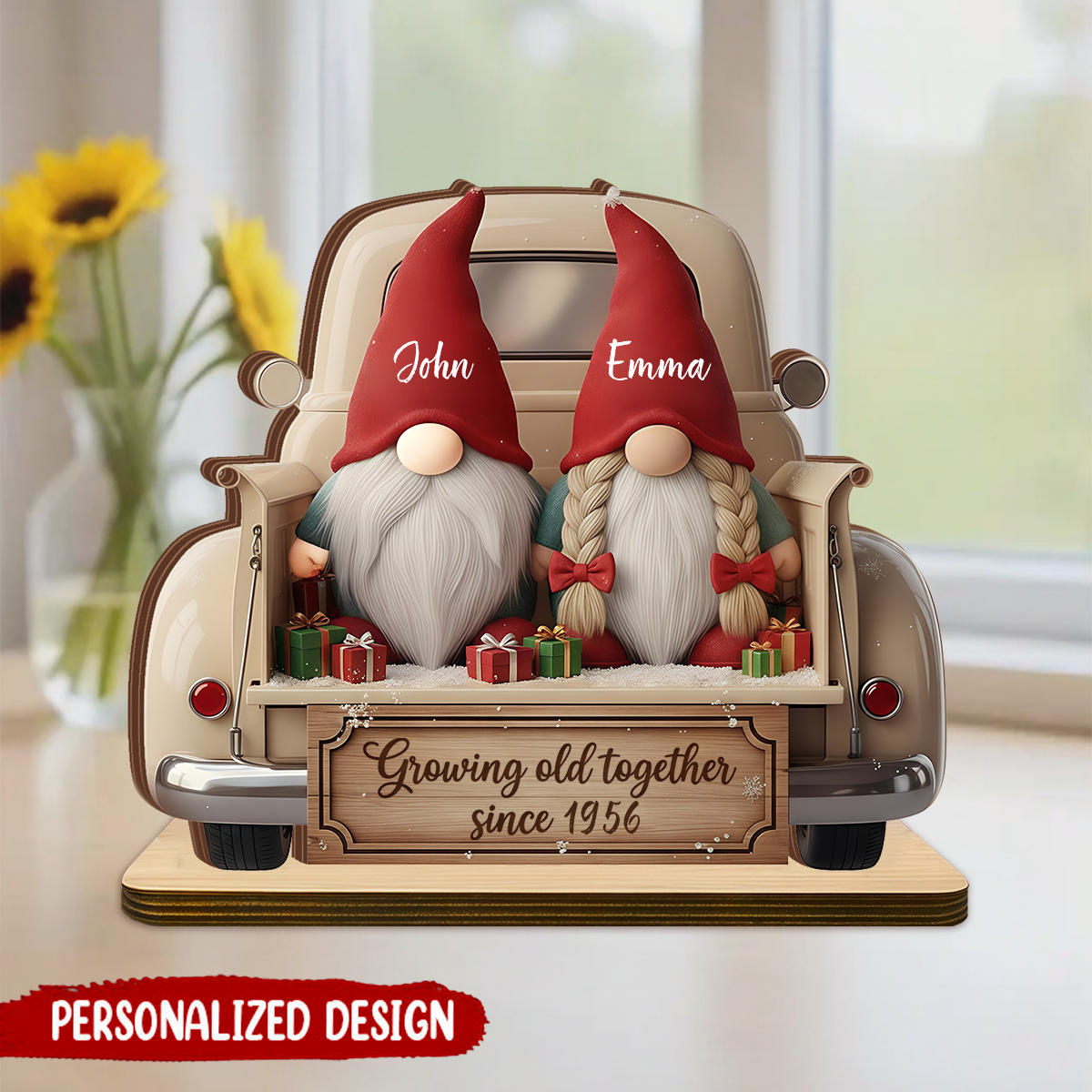 It's never too early to prepare for the warm and joyful charm of the Christmas season! This adorable personalized couple's figurine features a couple wearing red pointed hats, sat in the back of a vintage beige truck. The truck was filled with Christmas presents. The wooden plaque at the base reads "GROWING OLD TOGETHER SINCE" conveying the beautiful sentiment of years of companionship and shared time. Commemorating long-lasting relationships, such as those between a couple, and incorporating Christmas elements, it adds a touch of warmth and joy to your holiday decor.