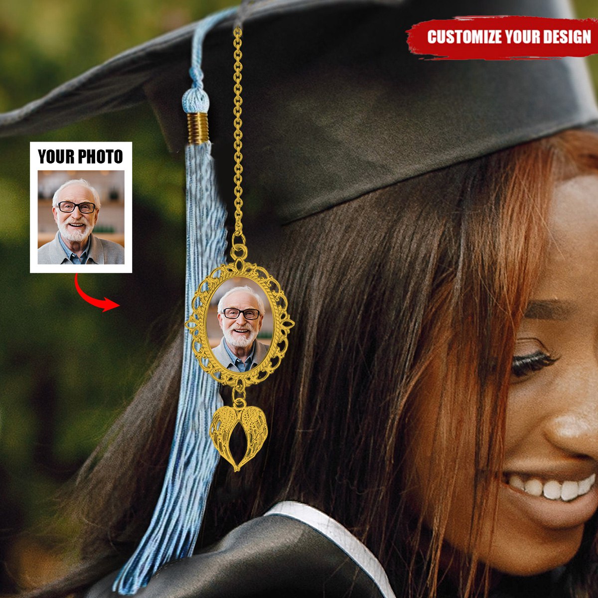 Keep your cherished memories close on your graduation day with this personalized graduation tassel charm and memorial photo charm. Capture the essence of your loved one by adding their photo to this custom keepsake, ensuring they're with you on this significant milestone. Whether it's for yourself or a dear one, commemorate a special person who may no longer be with us with this heartfelt gift.